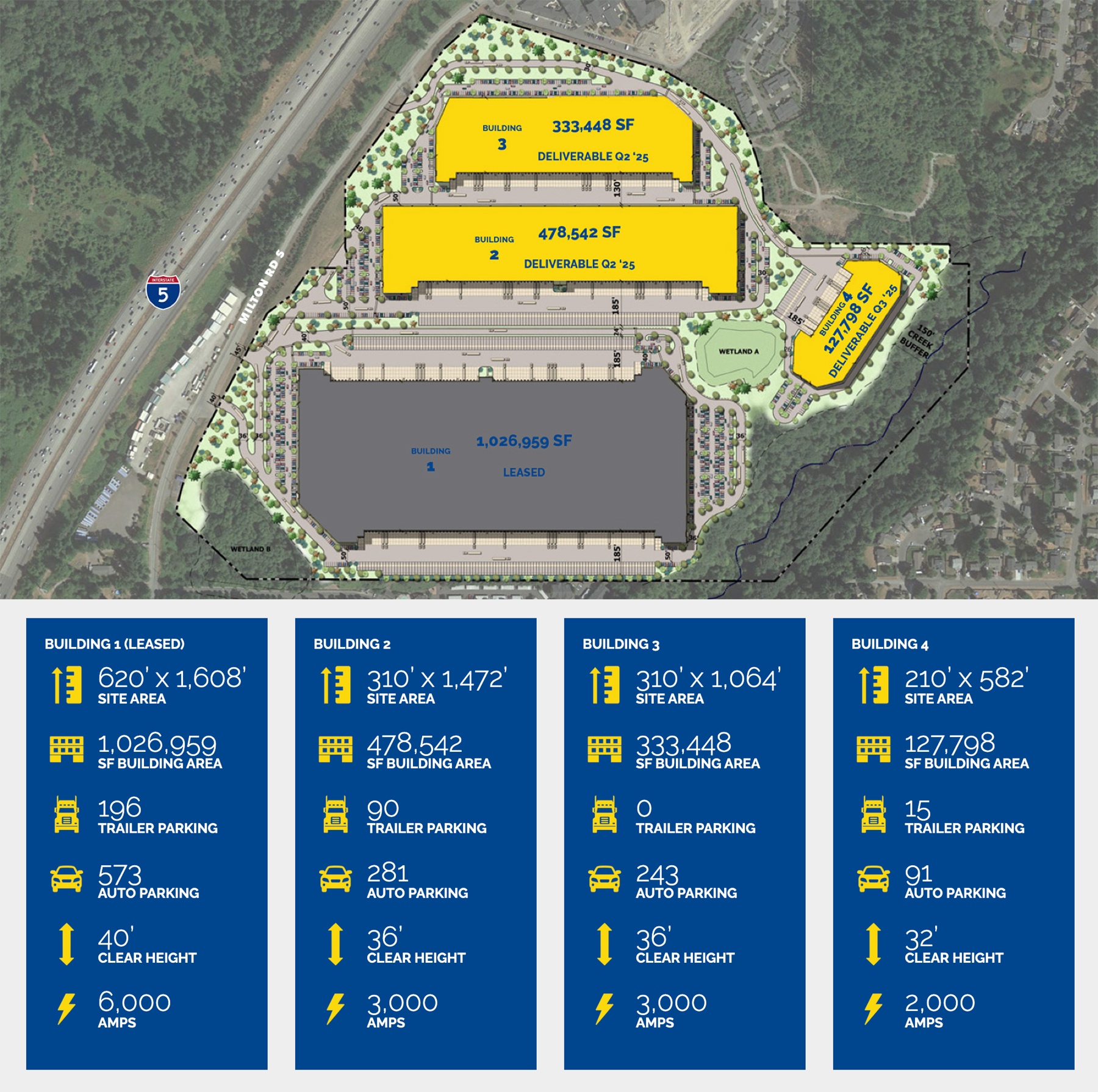 Building 1 alone features a 1,026,959 SF speculative facility with 40′ clear height, 150 dock‑high doors, 4 grade‑level doors, and over 175 trailer and 570 auto parking stalls — optimized for seamless logistics flow.