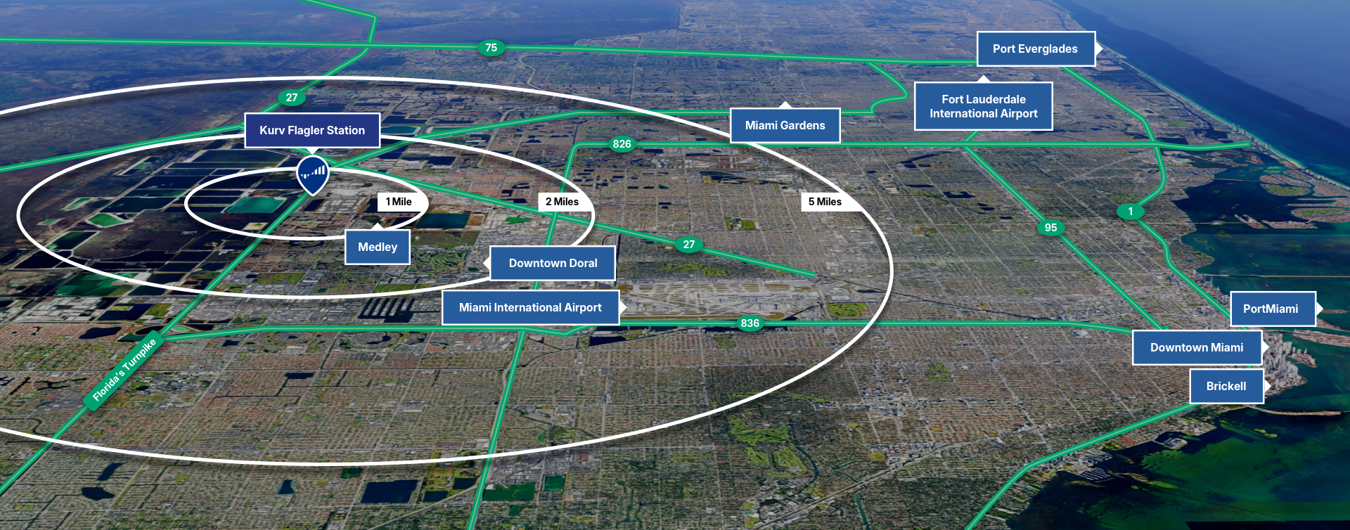 Centrally located, Kurv Flagler Station boasts immediate access to the Florida’s Turnpike, Palmetto Expressway and State Road 27.